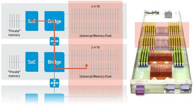 The Machine är en experimentell dator som innehåller flera processorer, som var och en har en egen minnesmängd. Men utöver det “privata” minnet har varje processor tillgång till en stor mängd delat minne, alla kan läsa från och skriva till samtidigt.