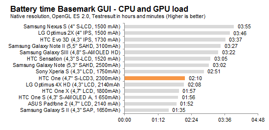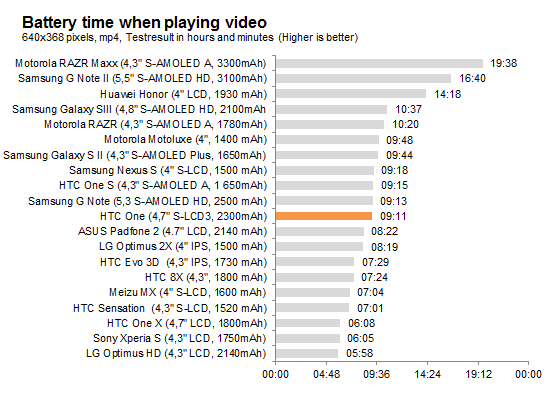 HTC verkar äntligen ha insett att man kan ha ett stort batteri utan att telefonen blir tjock som en tegelsten. Med ett inbyggt batteri på 2 300 milliamperetimmar placerar sig HTC One högt upp, men med en stor, ljus och högupplöst skärm samt ett gränssnitt som uppdateras automatiskt är det inte givet att det kommer resultera i bättre batteritider. Vi börjar med ett videouppspelningstest med 50 procent ljusstyrka och flygplansläge aktiverat.