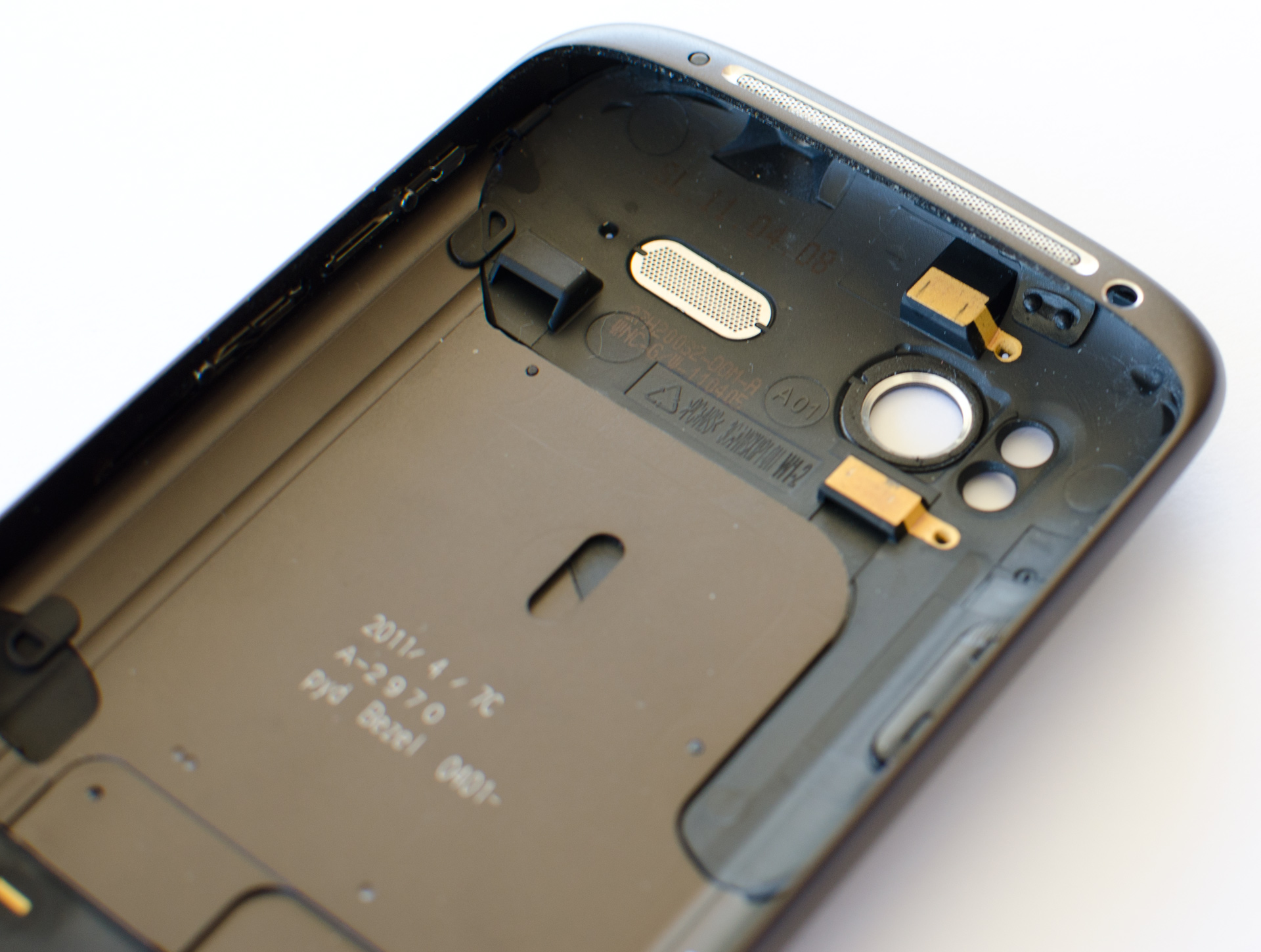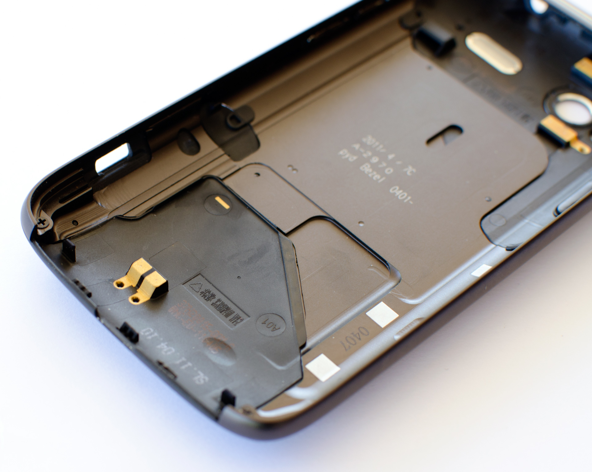 I övrigt ser vi här tydligare hur metallramen fästs med de två plastkåporna samt att vi kommer närmare de komponenter som gömmer sig härunder. En micro-SD minneskortplats som ockuperas av det medföljande 8GB kortet samt en SIM-plats för ditt telefonkort. Det 1 520 mAh stora batteriet har också sin plats här. Noterbart är också att byte till ett större (fysiskt) batteri troligtvis blir om inte knepigare så dyrare. Troligtvis kräver detta ett helt nytt skal och med sin inbyggda antennförstärkning är detta troligtvis en modifikation som kostar mer än det smakar.