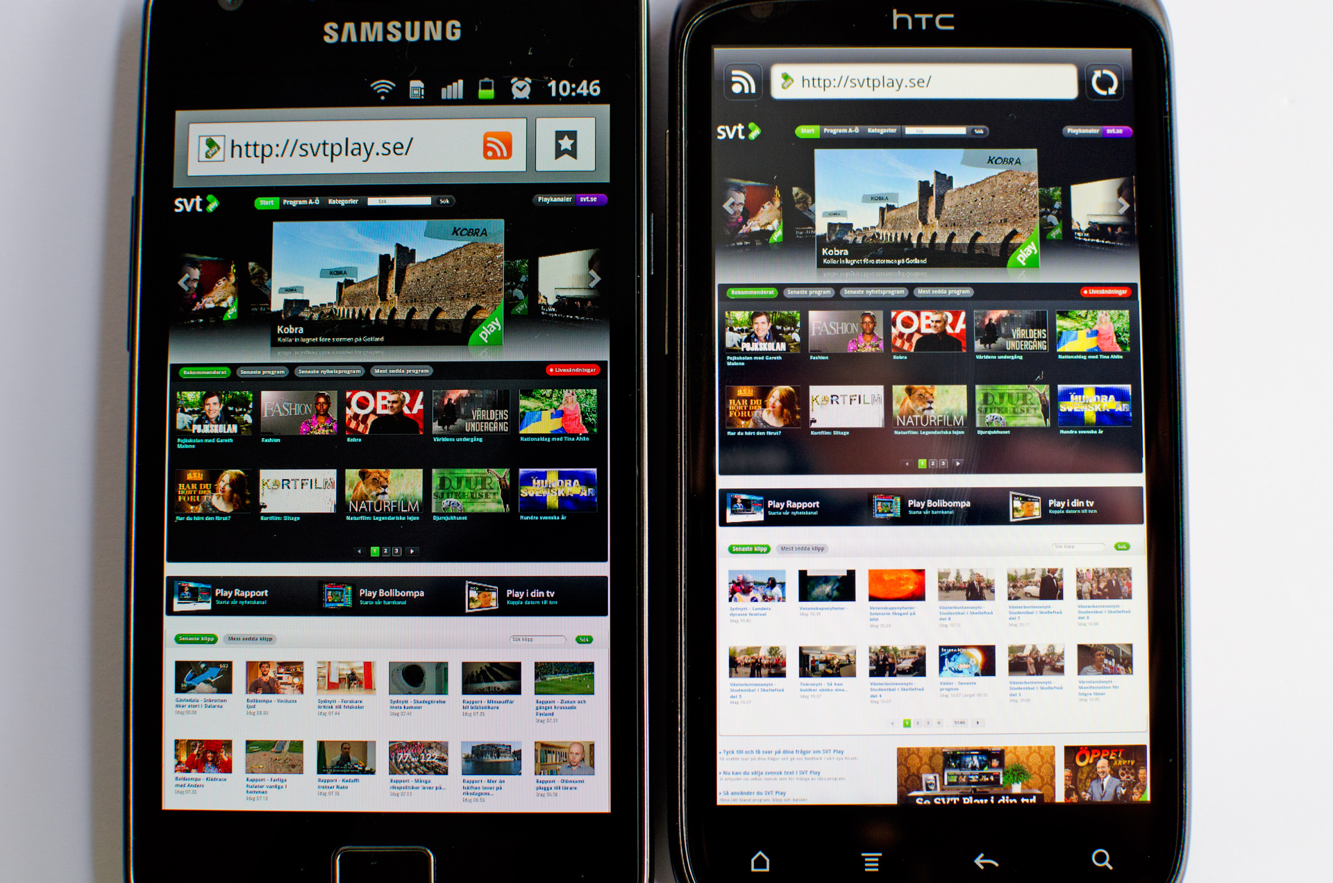 Det är svårt att jämföra upplevelsen mellan skärmarna i Sensation (SLCD) och Galaxy S II (Super-AMOLED Plus) i ord. Men den känslan man får när man tittar på skärmarna, inte minst bredvid varandra, är att SAP-panelen i Samsungs telefon ger skärmen en närmast pappersliknande känsla. Vid vanlig användning kan vi inte urskilja var skärmens svarta rullgardinsmeny slutar och den svarta plastramen tar vid och det känns bitvis inte som att det är en skärm man tittar på utan en fast bild. Detta är något man åstadkommer genom sin avgrundsdjupa svärta men också genom extremt goda betraktningsvinklar och bra antireflexbehandling.