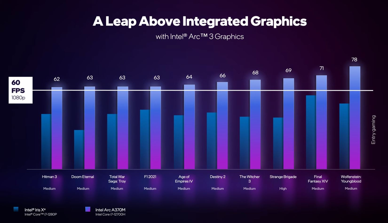 De två enheter som nu lanseras är Arc A350M och Arc A370M. Dessa är enligt Intel riktade mot gaming i 1 080p-upplösning. Här ser vi sex respektive åtta Xe-kärnor och fyra gigabyte videominne över en 64-bit bred minnesbuss. Grafikkorten kommer även med lika många raytracing-enheter som Xe-kärnor. Arc A350M kommer med en klockhastighet på 1 150 MHz och A370M kan sträcka sig upp till 1 550 MHz. Grafikkortens TGP-värden sträcker sig från 25 till 35 W för A350M och 35 till 50 W för A370M.