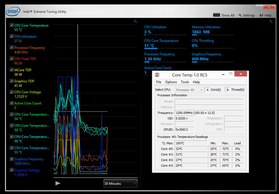 Positivt var dock att varken temperaturer eller strömförbrukning skenade under våra överklockningsbravader. Med förhållandevis låg spänning ökade förbrukningen från 94 till 146 watt i Battlefield 3. En ganska rejäl ökning men då med både CPU och GPU överklockade. Temperaturen höll sig däremot vid maximalt 72 grader med en tyst Noctua NH-C14 kylare med en ensam fläkt. Med andra ord såg vi inga problem med skenande temperaturer som annars var ett problem med Ivy Bridge och Core i3-3770K.