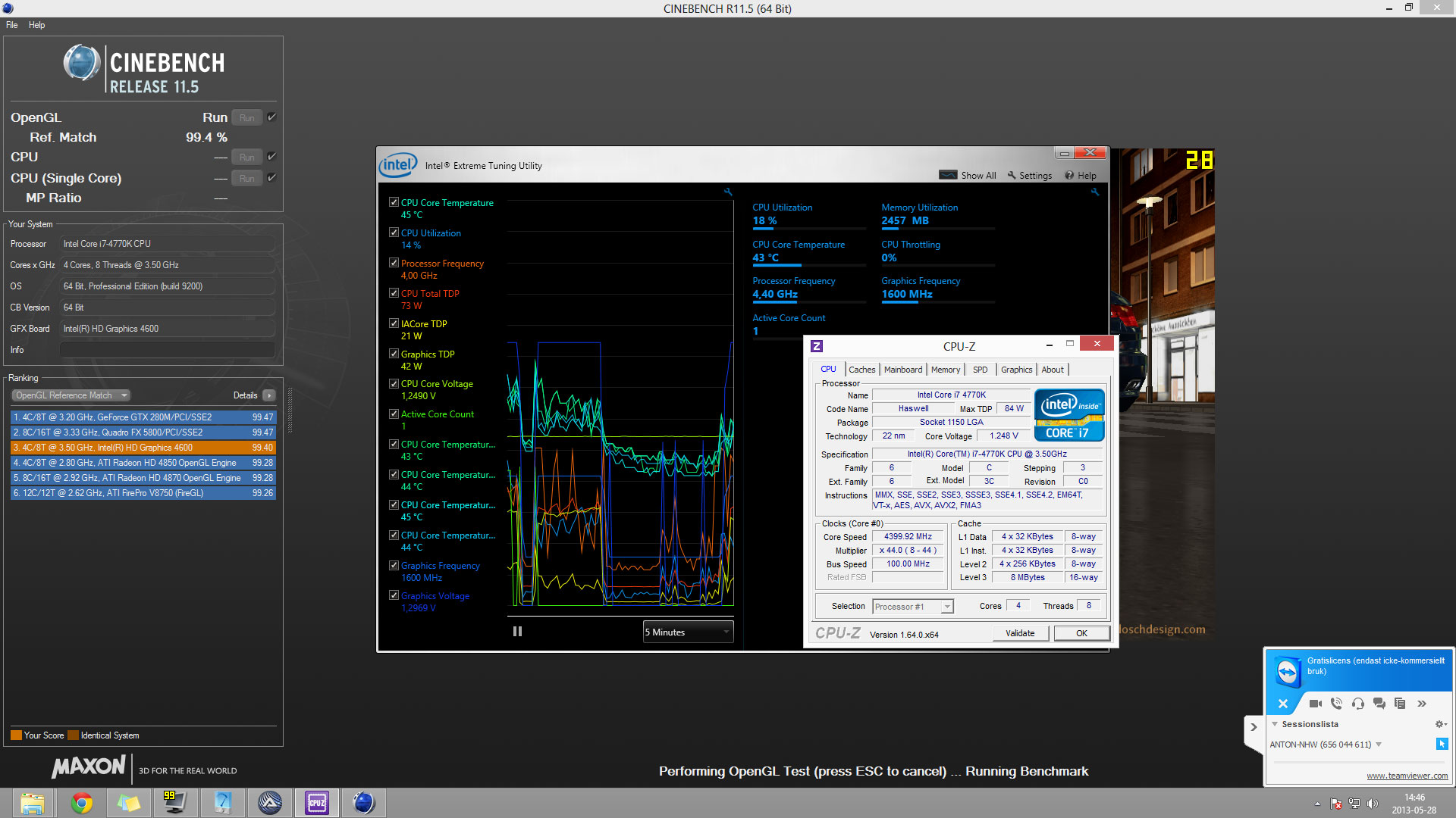 Med toppmodellen avhandlad gick vi vidare till lillebror 4670K. Här har Intel valt att klippa bort Hyperthreading-stödet och sänka basfrekvensen till 3,4 gigahertz. Förfarandet och också resultatet visade sig bli identiskt med våra turer kring storebror. CPU-kärnorna fastnade vid 4,4 gigahertz och grafikdelen vid 1,6 gigahertz. Ett tydligt tecken på att våra resultat med 4770K troligtvis är ganska represantiva för vad Haswell-kislet är kapabel till.