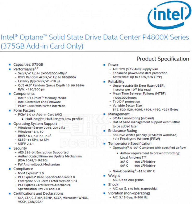 En specifikationslista har dykt upp för en av Intels kommande SSD-enheter som baseras på 3D Xpoint. Enheten, som heter Optane DC P4800X, utlovas vara uppåt 13,2 petabyte skriven data, eller kunna skriva hela sin lagringsvolym 30 gånger om dagen.