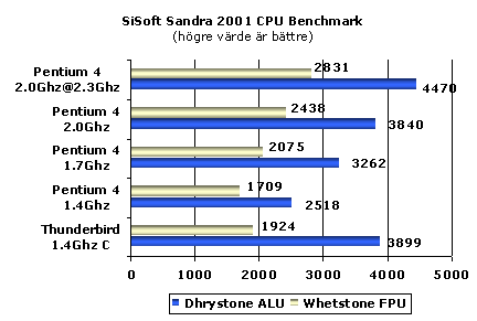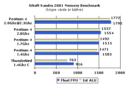 Vi börjar med CPU testet där vi ser hur Athlon processorn faktiskt vinner ALU testet över alla andra bortsett från den överklockade P4:an. I FPU testerna är det P4 processorerna som dominerar även om 1.4Ghz modellen hamnar sist återigen. En sak man ska veta är att P4 processorns höga FPU hastighet beror till väldigt stor del på dess SSE2 instruktioner vilket inte Athlon processorn är utrustad med. Utan SSE2 instruktionerna får 2.0Ghz processorn ett FPU värde på 1189. Så det finns tydligen tillfällen då SSE2 verkligen kan göra mycket för prestandan.