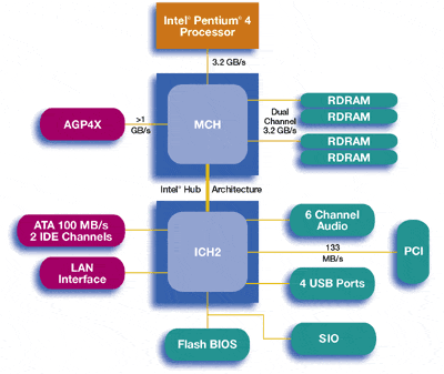 På diagrammet ovan kan man se hur i850 chipsetet är uppbyggt. De dubbla RDRAM kanalerna med två minnesmoduler i varje kanal, AGP 4x och såklart IDE-kanaler, USB portar m.m.