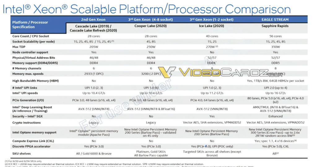 Processorerna kommer bygga på Intel 10 nm Enhanced SuperFIN tillverkningsprocess. Här kommer det röra sig om upp till 56 kärnor per processor och TDP-värden på upp till 350 W. Sapphire Rapids kommer även med möjligheten att användas i upp till åtta socklar samtidigt i ett och samma system. Bilden visar även att processorerna kan få stöd för upp till åtta kanaler DDR5-4800 internminne och 80 PCI Express kanaler.