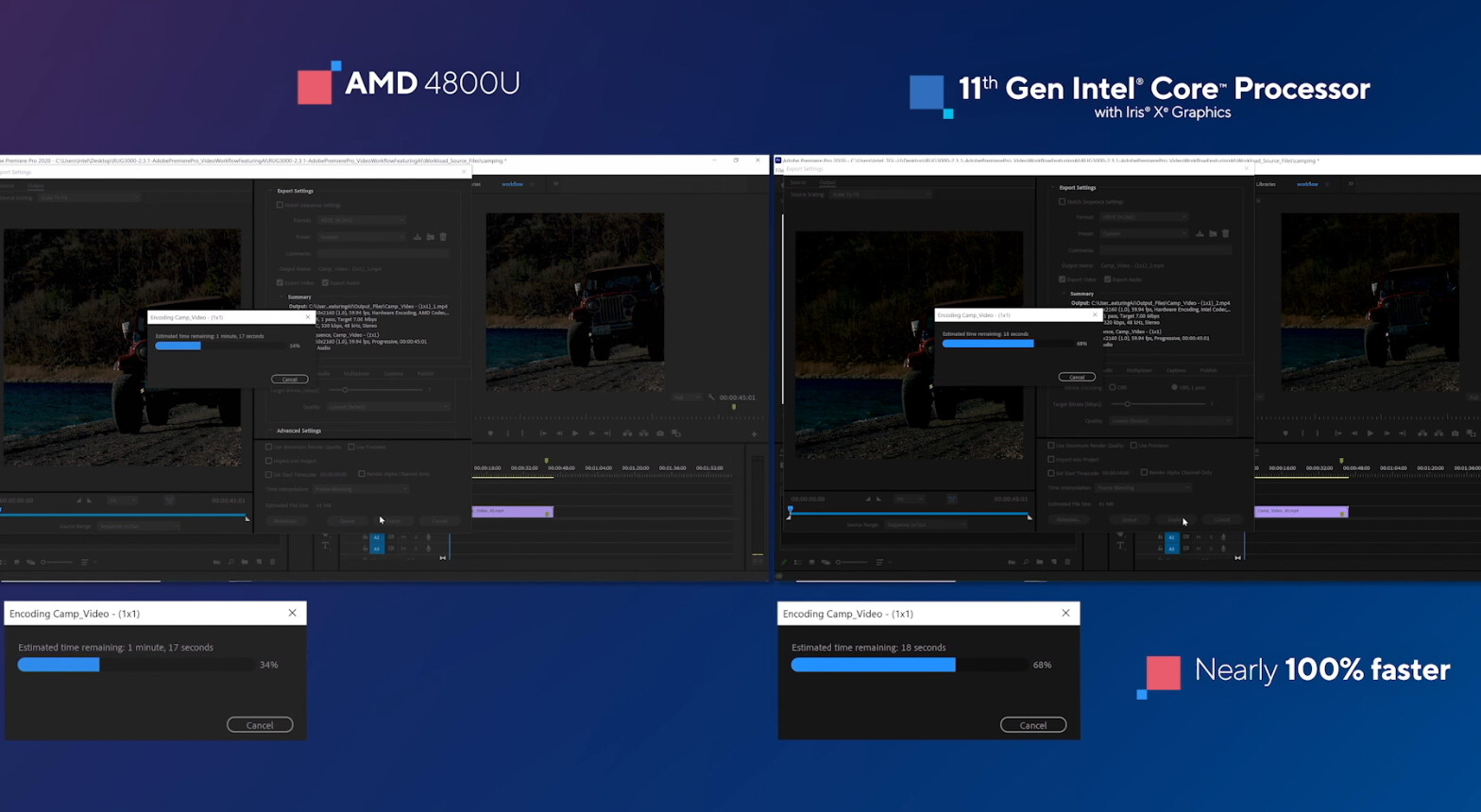 Intel tog och jämförde AMD:s Ryzen 4800U mot en av sina Tiger Lake-processorer. Här var den nya Intel-enheten 200% snabbare att färglägga 100 år gamla foton i Photoshop Elements och skala upp bilderna med Topaz gigapixel AI. Här ska AMD-systemet ha tagit ungefär två minuter på sig att utföra uppgifterna medans Intel-systemet blev klart på under 40 sekunder.