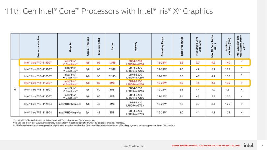 De nya processorerna går under namnet Core i7-1195G7 och Core i5-1155G7. Dessa kan ses som en minimal uppfräschning av processorserien. Det rör sig om två fyrkärniga processorer med åtta kärnor. Båda kommer utrustade med Intel Iris Xe-grafik och tar sina platser ovanför Core i7-1185G7 respektive i5-1145G7. Processorerna kommer med samma mängd cacheminne, TDP-värde samt minnesstöd som sina i7 och i5-syskon. Vad som skiljer dessa åt är dock de smått uppskruvade klockfrekvenserna.
