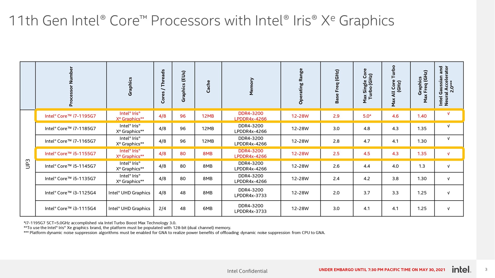 De nya processorerna går under namnet Core i7-1195G7 och Core i5-1155G7. Dessa kan ses som en minimal uppfräschning av processorserien. Det rör sig om två fyrkärniga processorer med åtta kärnor. Båda kommer utrustade med Intel Iris Xe-grafik och tar sina platser ovanför Core i7-1185G7 respektive i5-1145G7. Processorerna kommer med samma mängd cacheminne, TDP-värde samt minnesstöd som sina i7 och i5-syskon. Vad som skiljer dessa åt är dock de smått uppskruvade klockfrekvenserna.