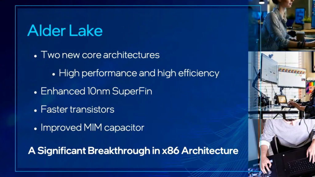 Alder Lake kommer att byggas på Intels ”Enhanced 10nm SuperFin”-teknik som ska förbättra effektivitet. Hybridarkitekturer är inte helt nytt för Intel. Lakefield lanserades under 2020 med små och stora kärnor men den var främst anpassad för mycket tunna och energisnåla enheter. Intel Alder Lake kommer alltså att anpassas för en betydligt större bredd av enheter. Den nya arkitekturen väntas inkludera flera stora nyheter för datorbranschen, inklusive DDR5 och PCIe 5.0.