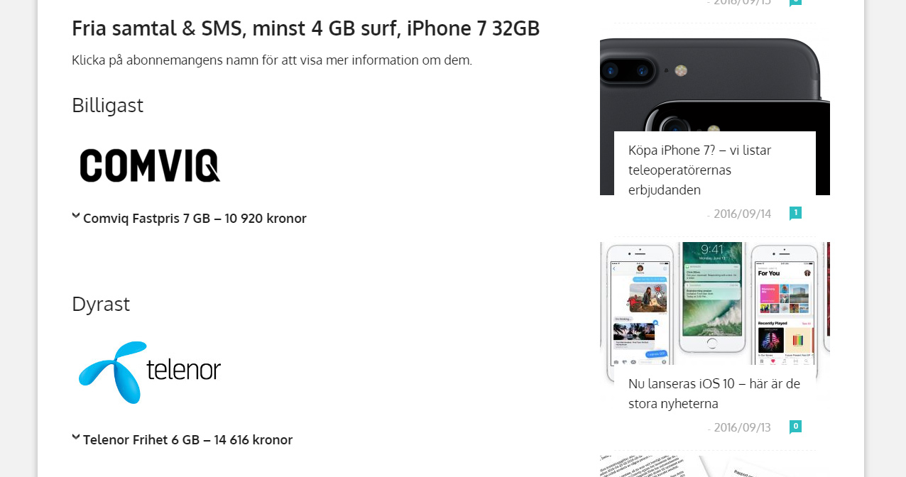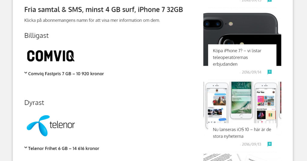 För dig som redan, eller i alla fall nu, bestämt dig för att köpa Apples nya Iphone kan det vara läge att se vart du får mest för pengarna. Ska du inte köpa telefonen kontant har Surfa satt ihop en jämförande lista över alla de bästa erbjudandena från svenska teleoperatörer där det skiljer nästan 3 000 kronor mellan de billigaste och dyraste erbjudandena. För den som nöjer sig med en surfpott på 4 gigabyte är Comviq billigast medan Halebop tar hem segern när du ökar surfpotten till 10 gigabyte. Det blir oavsett vad en rejäl investering för den som vill knipa en Iphone 7 med totalkostnader på mellan knappt 11 000 kronor upp till drygt 15 000 kronor beroende på surfpott.