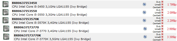 I väntan på den fullskaliga lanseringen har nu svenska datorbutiken microshop.se varit lite het på gröten och listat fem olika nya processormodeller ur Intels Ivy Bridge-familj. Tre av dessa härstammar från tillverkarens Core i5-serie med fyra CPU-kärnor. Medan två modeller hittas i toppserien Core i7 där det förutom fyra CPU-kärnor även tillkommer stöd för flertrådstekniken HyperThreading.