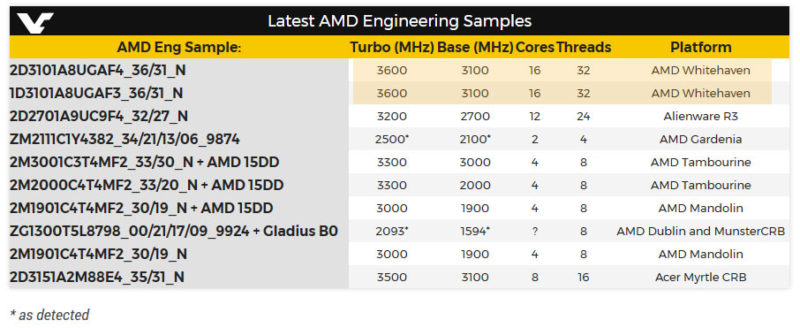 En ny läcka som publicerats av Videocardz innehåller vad som påstås vara detaljer och specifikationer om denna kommande plattform. I läckan nämns plattformen Whitehaven tillsammans med två ingenjörsexemplar av en ännu olanserad processor.
