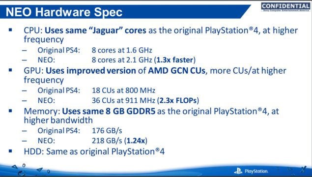 Ett dokument har hittat ut på internet, och påstås vara ett bildspel tänkt att ge riktlinjer till de spelutvecklare som kommer ta fram nya titlar till Playstation-plattformen framöver. I dokumentet beskrivs möjligheten att inte bara visa video i 4K-upplösning, utan även rendera faktiska spel i den högre upplösningen. Konsolen ska även klara av både högre och mer stabila bildfrekvenser än originalet.neo_03