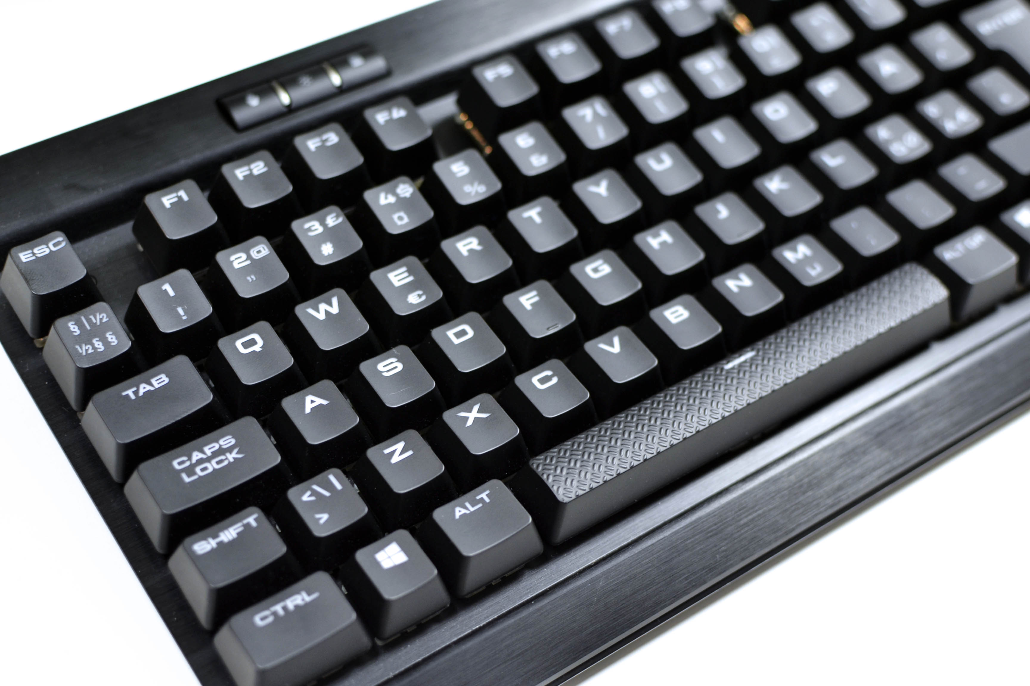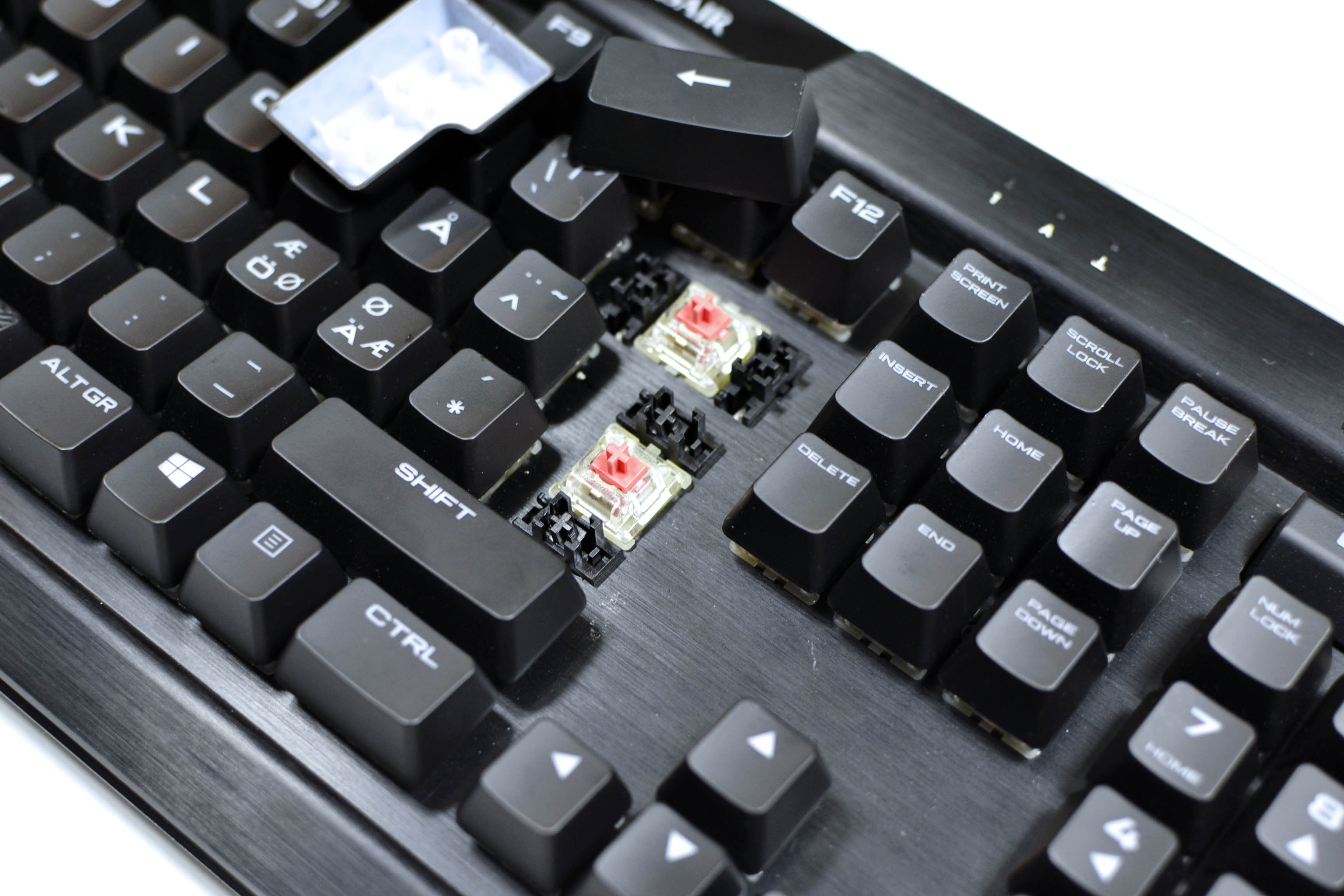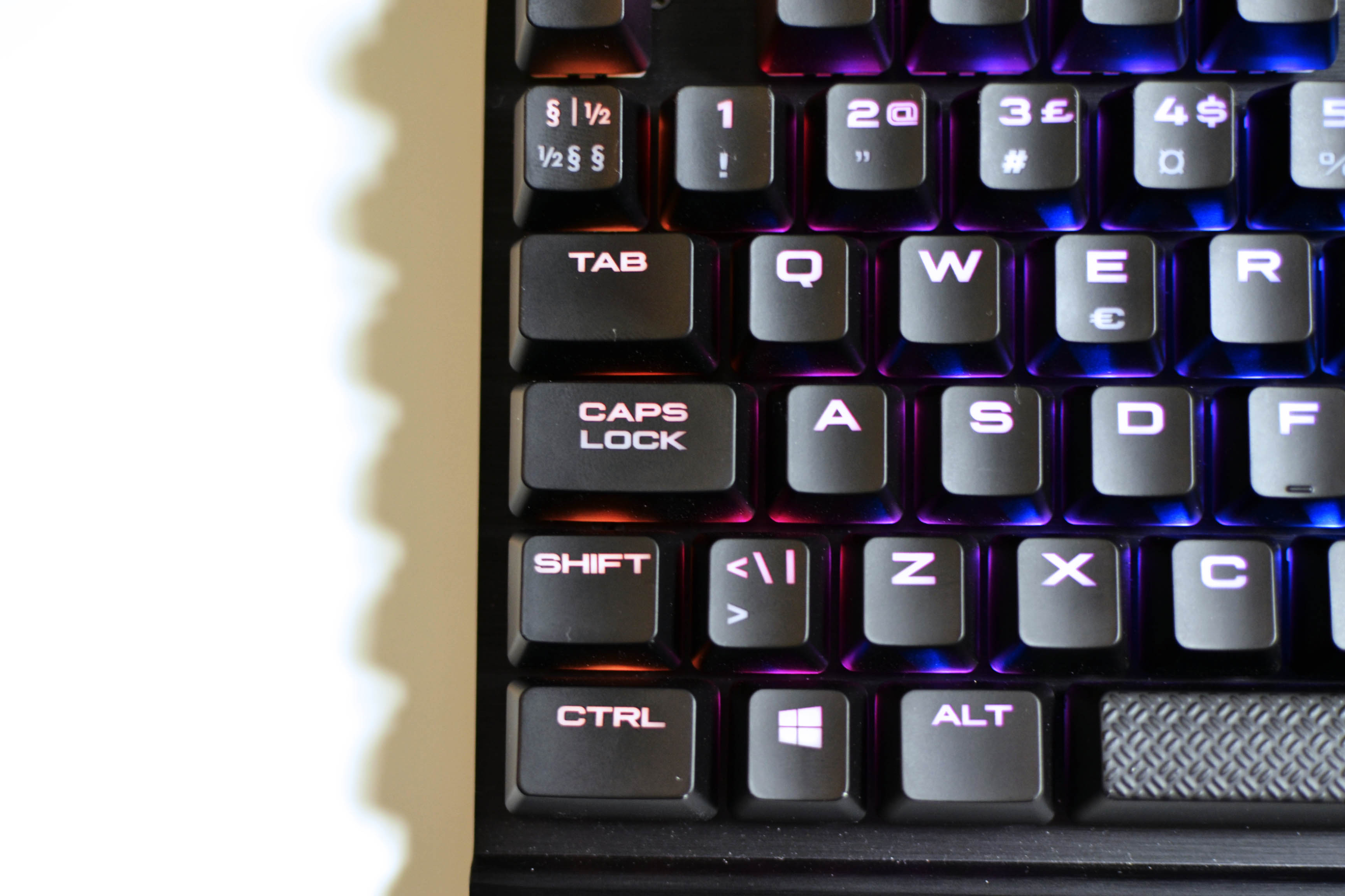 Corsair faller även dem, likt Razer, på misstaget av att ha genomskinliga keycaps med radbruten inskrift. Vid exempelvis Caps Lock-tangenten, §-tangenten och <-tangenten blir det tydligt att den undre raden är sämre belyst än den övre. Det ser fult ut, och när Corsair har RGB-belysning som en av sina främsta säljargument, så lämnar det ett dåligt intryck.