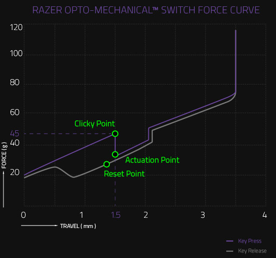 Av formkurvan kan vi utläsa att Razer menar att det taktila guppet är väldigt skarpt, men ändå rätt lätt – alltså är brytaren inte menad att vara särskilt taktil. Vi upplever inte brytaren som det minsta taktil, alls faktiskt. Vi upplever den som nästintill linjär, vilket blir mer uppenbart om vi inte hör klicket. Våra sinnen luras lite om vi faktiskt lyssnar på brytaren, vid aktivering så avger brytaren ett klick – och vi får för oss att vi har upplevt något taktilt, då det förknippas med klicket. Om vi istället tar på oss hörlurar så att vi inte kan höra klicket så blir det uppenbart att brytaren knappt är taktil, den känns snarare linjär.