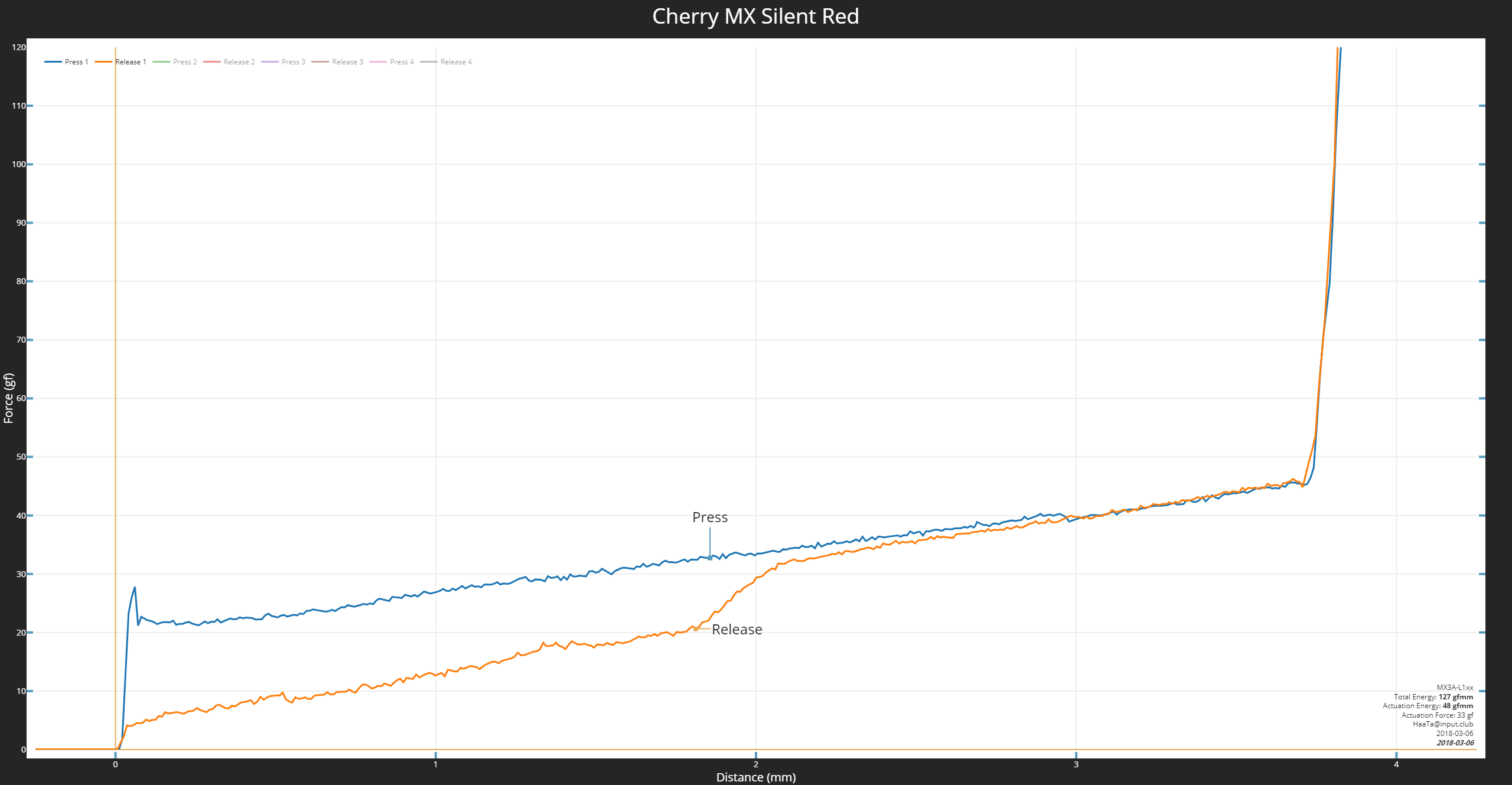 Av kraftdiagrammet nedan att döma, utfört av tangentbordsentusiasten HaaTa, så är den faktiska aktiveringskraften endast 33cN~, vilket skiljer sig rätt markant mot den marknadsförda aktiveringskraften 45cN. Istället bottnar brytaren vid 48cN. Värt att notera är att testet är utfört på en vanligt Cherry MX Silent Red, och inte en Cherry MX Silent Red RGB – men de ska ha samma specifikationer. Det visar på hur stora toleranser Cherry jobbar med, de specificerar ±15cN för majoriteten av sina brytare. Det är för oss ännu en anledning till att vara skeptiska till marknadsförda siffror, om inte oberoende tester finns tillgängliga för att styrka eller dementera. Vi har inte utfört test själva då vi saknar instrument för detta, men vi upplever brytaren som lite lättare än det specificerade 45cN vid aktivering.