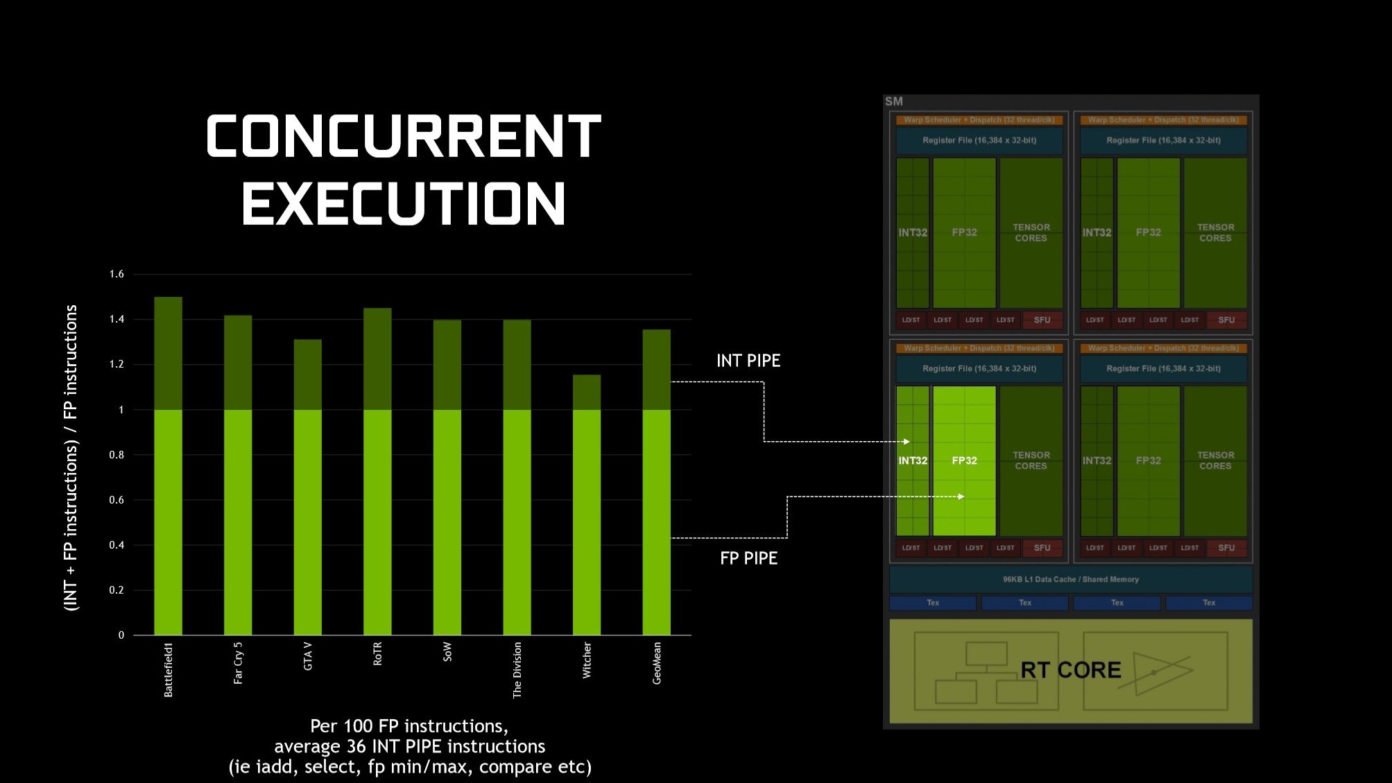Medans spel för det mesta använder sig av FP32-beräkningar så är det även en del INT32-beräkningar som måste hanteras. Nvidia räknade ut att för varje 100 FP32-beräkningar så måste grafikprocessorer även hantera omkring 36 stycken INT32-beräkningar. Då arkitekturen Pascal inte kunde hantera dessa två olika belastningar samtidigt innebar det att när en INT32-beräkning hanterades satt de kärnorna som används för FP32-beräkningar och väntade. Något som resulterar i markant lägre prestanda än om de två kunde hanteras parallellt.