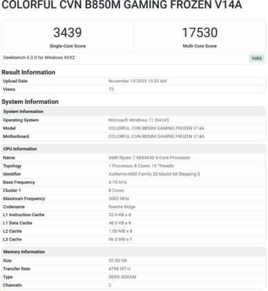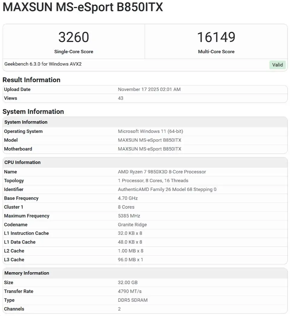 Först och främst kommer processorn med åtta processorkärnor och 16 trådar. Enheten kommer med 96 megabyte L3 cache och kan sträcka sig upp till 5,6 GHz under belastning. Kort och gott är det som en trimmad variant av Ryzen 7 9800X3D med 400 MHz högre turbofrekvens. Något som även bekräftas i tidiga testresultat som hittats i databasen för Geekbench.