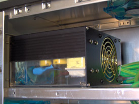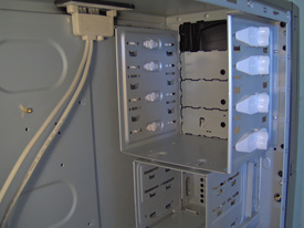 Bak i lådan har de gjort i ordning för att installera två stycken 80*80 mm fläktar för att ge så stort utblås som möjligt då det bara förbättrar funktionen med ett kryss gjort av galler. Eftersom de inte har en massa onödig plåt runt nätaggregatsplatsen så kan ett bra nätaggregat hjälpa till att sköta kylningen på ett effektivt sätt. De har valt att göra plats för en 80*80 mm fläkt i fronten också för att ge kylningen direkt mot hårddiskarna vilket är en fördel.
