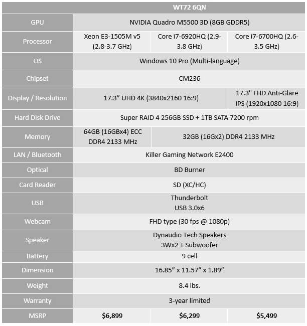 Designed for maximum performance, MSI’s WT72 is powered by NVIDIA’s Quadro M5500 GPU, Intel’s 6th generation Core-i7 and Xeon processors, and up to 64GB of DDR4 memory. The latest in professional graphics design technology, the Quadro M5500 is the world’s fastest mobile GPU, delivering up to 35% performance increase over previous models, with 2,048 cores for optimum speed and power.