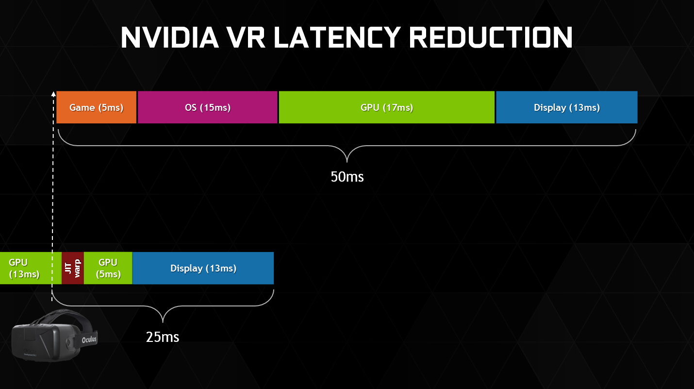 Dagens VR-headset kräver en uppdateringsfrekvens på 90 hertz för att leverera en bildupplevelse som känns bekväm men Nvidia har betydligt högre satta mål än så. Företagets “Zero Latency Display” uppdaterar sin bild var 0,58 millisekund, en uppdateringsfrekvens motsvarande 1 700 hertz.