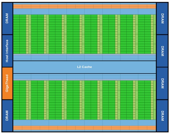 For handling memory Fermi is designed a lot like an ordinary CPU. It has shared memory, L1 and L2 cache and 384-bits memory bus that is attached to GDDR5 memory (first time ever for NVIDIA) and for the first time it supports ECC memory.