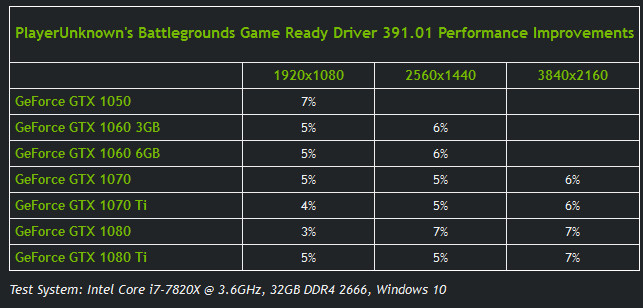 Utöver optimeringar för de kommande spelen som tidigare listats kommer drivrutinen även med en prestandaskjuts för merparten av grafikkort ur Nvidias GTX 10-serie i spelet PlayerUnknown’s Battlegrounds (PUBG). Beroende på grafikkortsmodell som används så kan kunder förvänta sig en prestandaökning på mellan 3 och 7 procent.