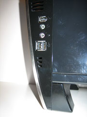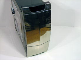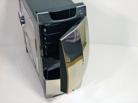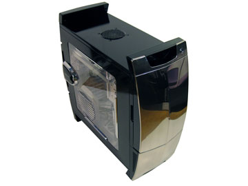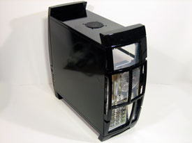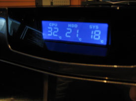 På framsidan hittar man de tre temperaturdisplayerna bakom ett rökfärgat fönster som passar riktigt bra in med den blanka svarta färgen som täcker resten av chassit. Man har även valt att sätta startknappen utanför luckan vilket jag tycker är bra så man slipper öppna den varje gång man ska starta datorn. På luckan sitter även lamporna som är tänkta för power och hårddiskarna, vilka passar in med den övriga stilen bra och sticker inte ut på något sätt.