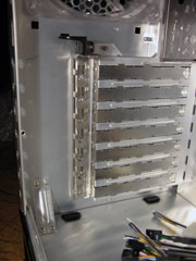 Inte heller till PCI-platserna behöver man verktyg, utan man använder en spak som spänner fast korten. Om man mot förmodan inte skulle tycka om denna smarta lösningen eller att det inte skulle fungera med ett av expansionkorten kan man plocka bort den och använda det klassiska systemet med skruvar. Om man väljer att använda skruvar har de satt hål i plåten, som vanligtvis sitter i vägen, för att man lättare ska kunna komma åt och skruva.