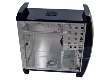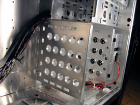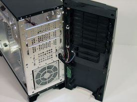 För att kunna ta loss sidopanelen behöver man skruva upp två skruvar, men dessa kan man lägga undan då handtaget klarar av att hålla kvar den galant. Insidan ser ganska vanlig ut och har ett hårddiskrack som är vridet 90º vilket tidigare har visat sig fungera bra. Hårddiskarna monterar man med hjälp av skenor som man bara trycker på hårddisken, inga verktyg behövs vilket är mycket smidigt. Samma system används även till 5.25”-enheterna och de externa 3.5” enheterna och skapar en mycket angenäm miljö att jobba i.