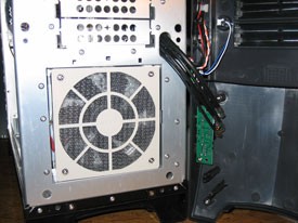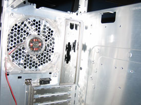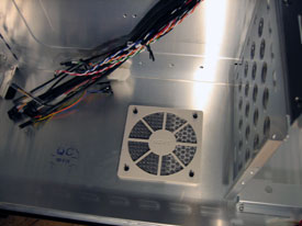 Det medföljer även en 120mm fläkt till fönstret på sidan av datorn, också den med filter framför. Även denna fläkt lyser med ett blått sken vilket säkert uppskattas mer av vissa än andra.