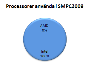 Vi börjar med processorvalet då alla grenarna i Svenska mästerskapen i datorprestanda och överklockning involverar vår CPU. Här ser vi samma förkrossande seger som förra året där Intel plockar hem en jordskredsseger med siffrorna 40 – 0. Ingen av deltagarna i SMPC2009 valde en processor från AMD. Men detta går samtidigt inte att se helt svart och vitt. Alla grenar i SMPC2009 baseras kring procentuell överklockning och har har Intel ett mindre övertag med speciellt sina lägre klockade processormodeller. Det står dock utom tvivel att Intel är en favorit bland överklockare.