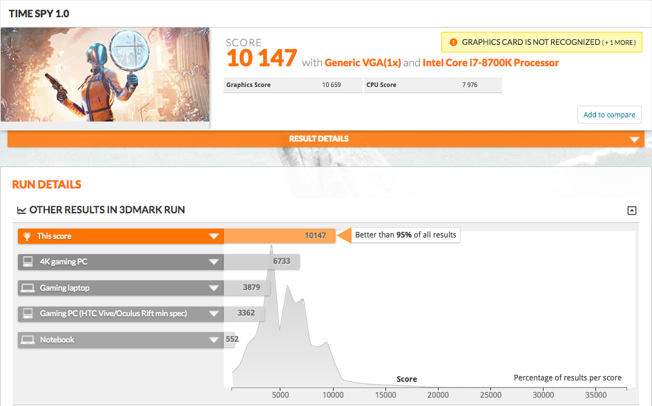 Ovanstående bild visar att systemet lyckades kamma hem en generell poäng på 10 147 och en grafikpoäng på 10 659. Detta med minnet klockat till 7 000 megahertz (MHz) vilket blir en effektiv klockfrekvens på 14 000 MHz. Grafikprocessorns klockfrekvens listas som 1 875 MHz. Med detta hamnar det kommande grafikkortets poäng en bra bit framför de resultat för GTX 1080 Ti och Titan Xp som finns i 3DMarks databas.
