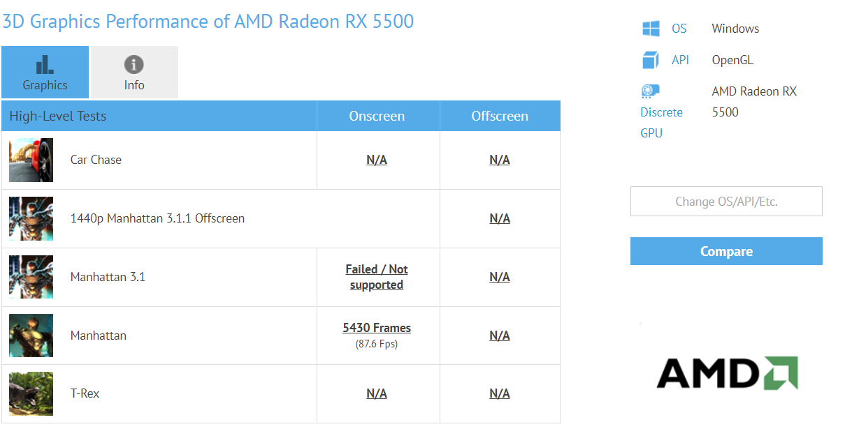 Medans databasen för GFXBench till viss del styrker ryktena kring Radeon RX 5500 bör de testresultat som listas tas med en nypa salt. Den obekräftade grafikkortsmodellen från AMD lyckas göra bra ifrån sig i Onscreen-delen för testsvitens Manhattan-portion. Däremot påpekar hemsidan Notebook Check att dessa resultat bör tas med en nypa salt. Detta då de kan vara felaktiga eller att den skärm som använts i just denna testomgång kan visa mer än 60 bildrutor per sekund.