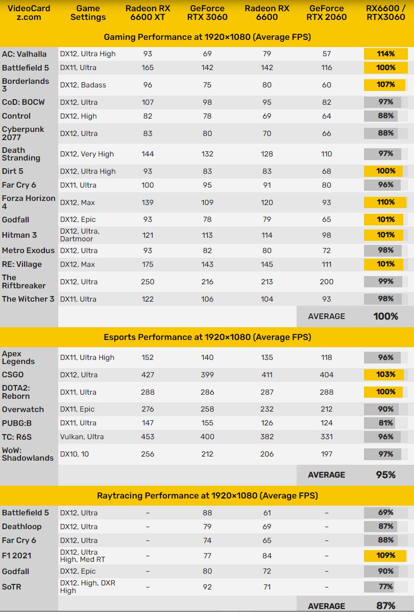 Recensionsguiden ska även komma med en drös prestandasiffror för grafikkortet i ett flertal speltitlar. Då Nvidia inte lanserat någon direkt utmanare till grafikkortet har man använt Geforce RTX 2060 och RTX 3060-enheter för att testa sin modell mot. Här ska RX 6600 ha lagt sig på i princip samma nivå som RTX 3060 och även en bit över i vissa spel när det kommer till antalet bildrutor per sekund.