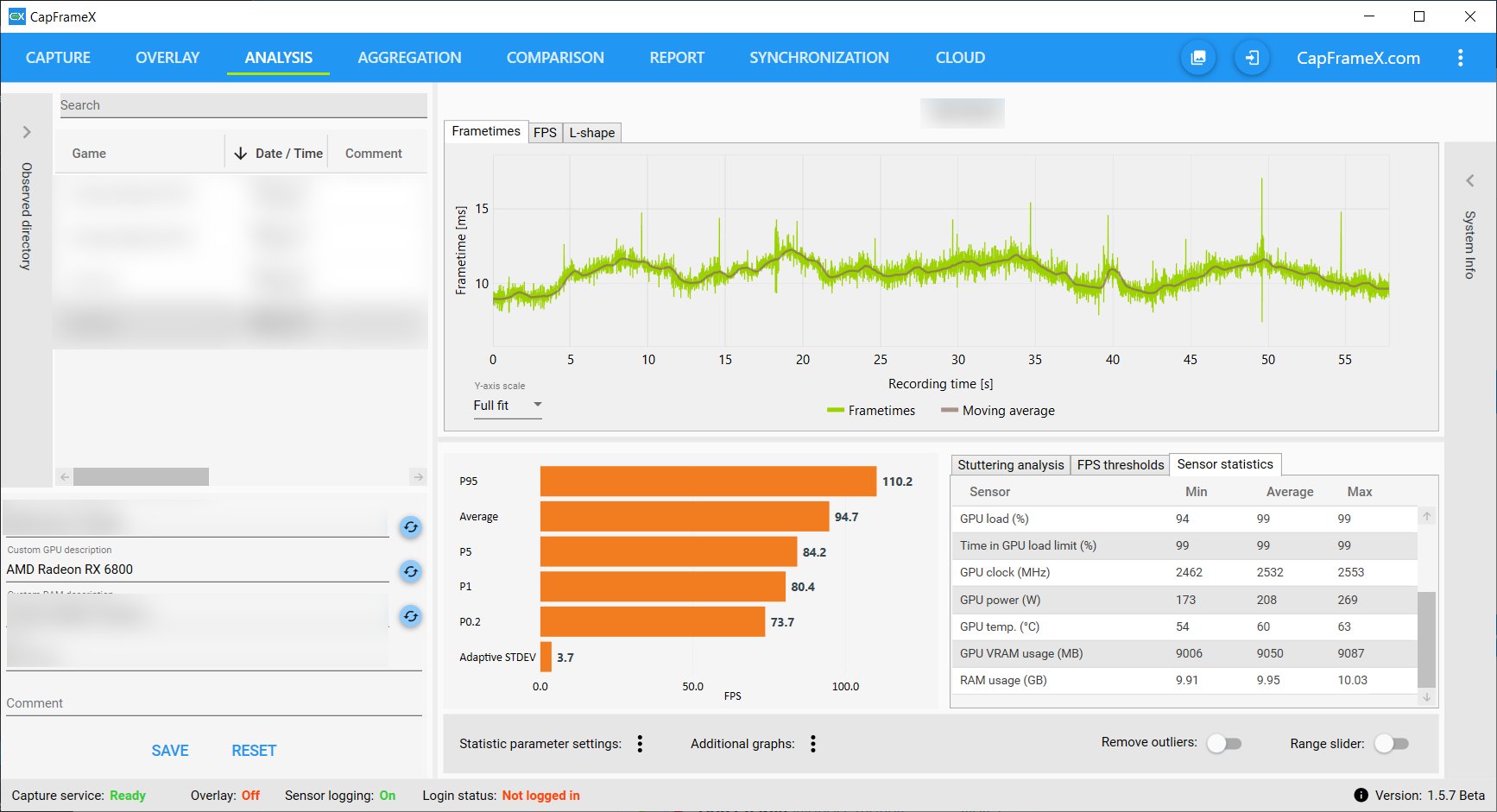 Enligt CapFrameX ska RX 6800 ha tagit sig till en maximal klockfrekvens på 2,553 GHz. Detta med en genomsnittlig klockfrekvens på 2,532 GHz och 2,462 GHz som dess lägsta klockfrekvens under stresstest. Skulle siffrorna visa sig stämma innebär det en ökning på över 20 procent jämfört med den turbofrekvens på 2,105 GHz enheten kommer med från fabrik.