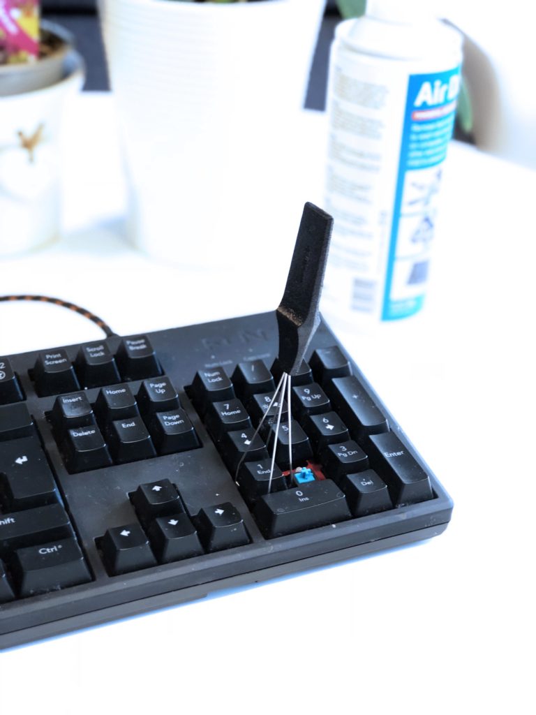 Vi börjar med att använda brytarlocksdragaren för att ta bort samtliga brytarlock. Se till att först ta en bild av tangentbordet innan ni sätter igång, det kommer att vara till stor hjälp när Ni sedan sätter tillbaka tangenterna mot slutet. Om Ni använder en brytarlocksdragare med vajer-design som vår, kila fast den under kanterna av brytarlocket och dra sedan försiktigt rakt upp. Om ni inte har en brytarlocksdragare så fungerar många improviserade lösningar med, som exempelvis tråd. Försök att undvika att använda fingrarna, då Ni löper risk att skada brytarstammen.