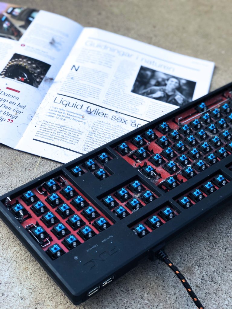 Med alla brytarlock borttagna, så är det dags att få bort all den smuts som vilar löst på ytan. Vi går utomhus och tar med oss en tidning som vi sedan lägger ned på marken. Sedan vänder vi på tangentbordet och skakar ovanför tidningen så att all smuts faller ned på den – därefter viker vi ihop tidningen för att enkelt kunna göra oss av med allt skräp vi samlat.