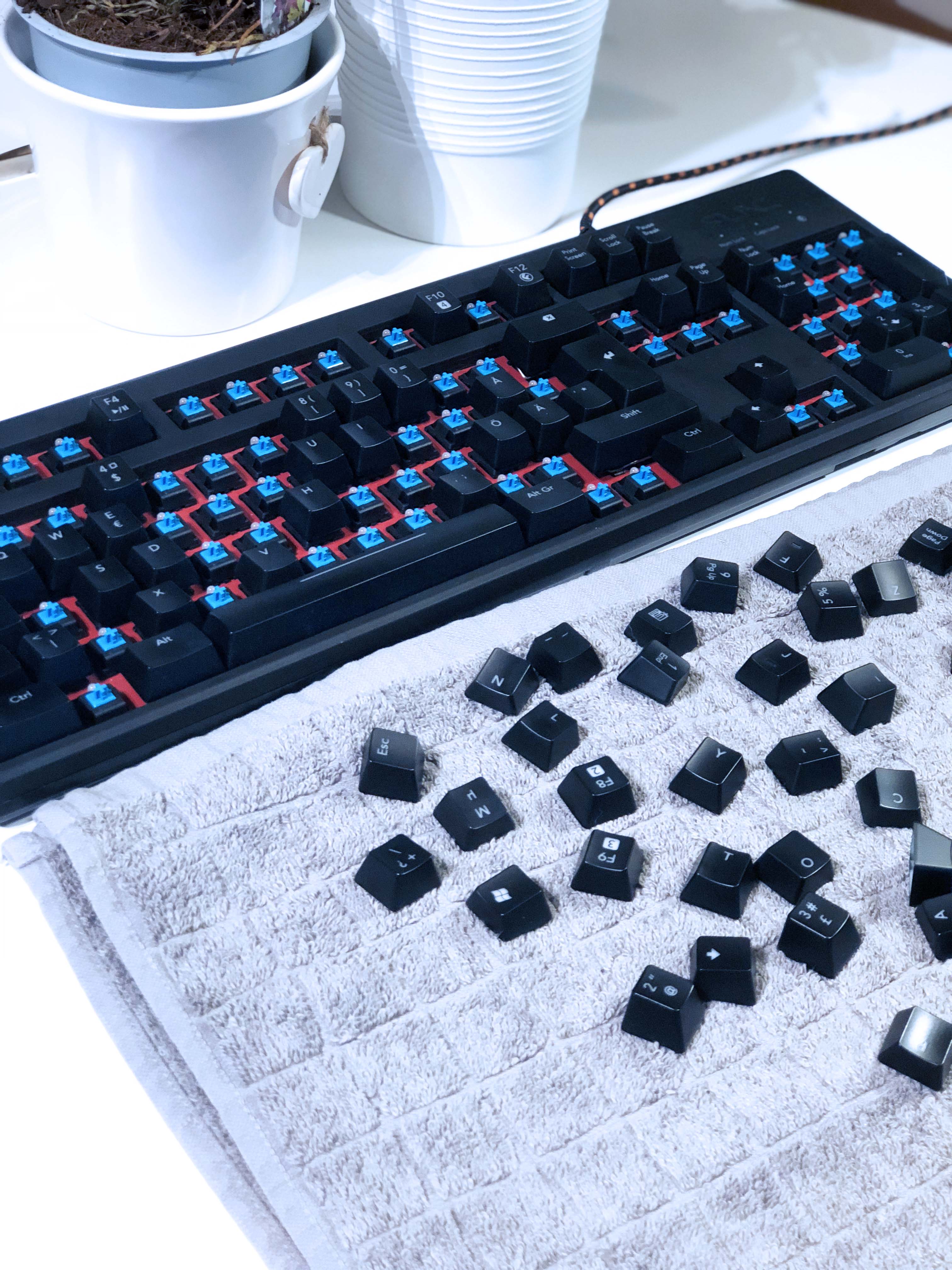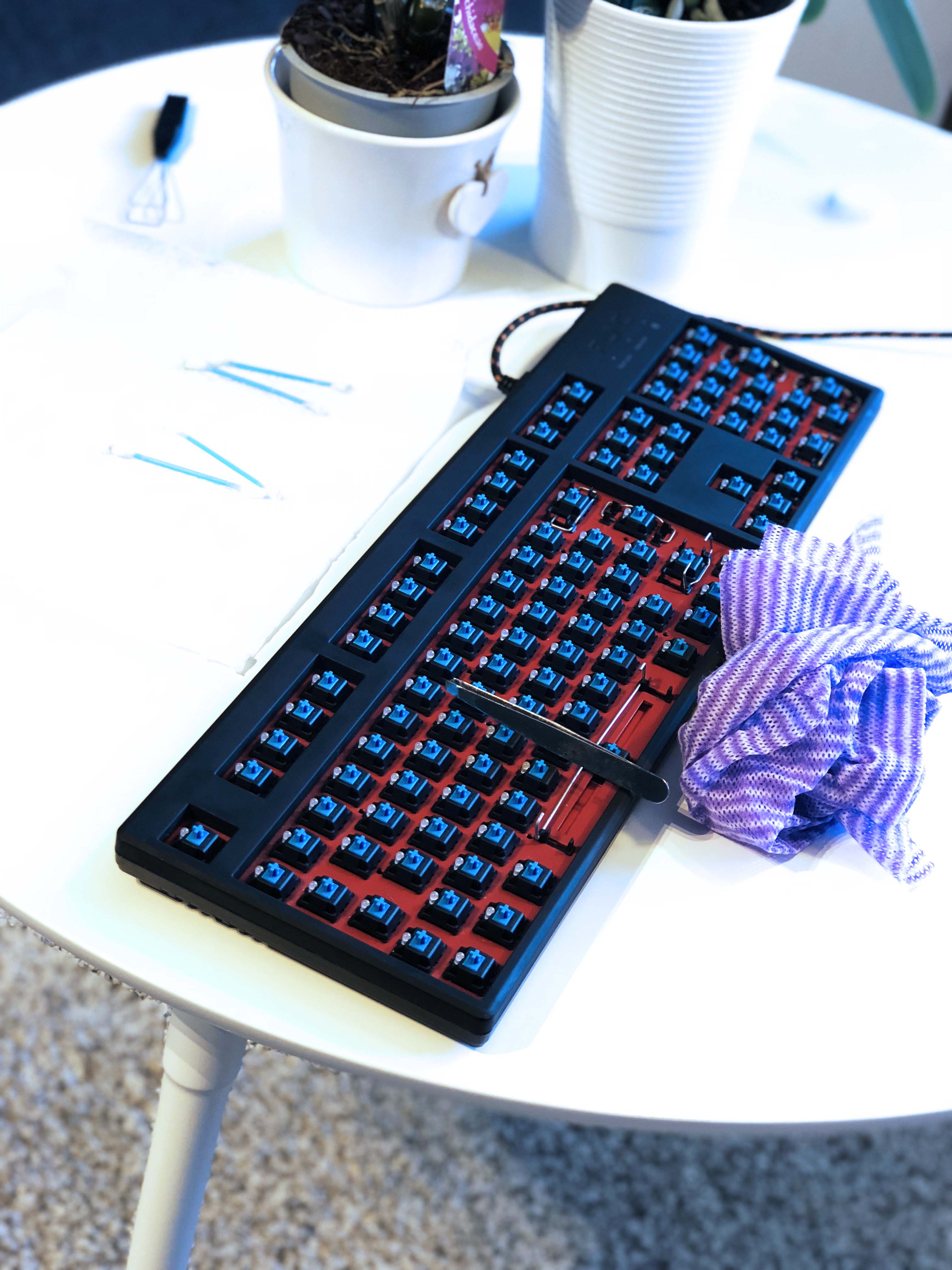 Medan brytarlocken torkar så är det dags att grovrengöra resten av tangentbordet. Vi börjar med att använda örontops för att gå över ytan av tangentbordet – det slinker mellan brytarna och gör det enkelt att komma åt alla hörn. Om stabilisatorerna är väldigt dammiga eller smutsiga så kan vi ta loss dem för att göra rent dem separat, använd vatten och en mjuk trasa.