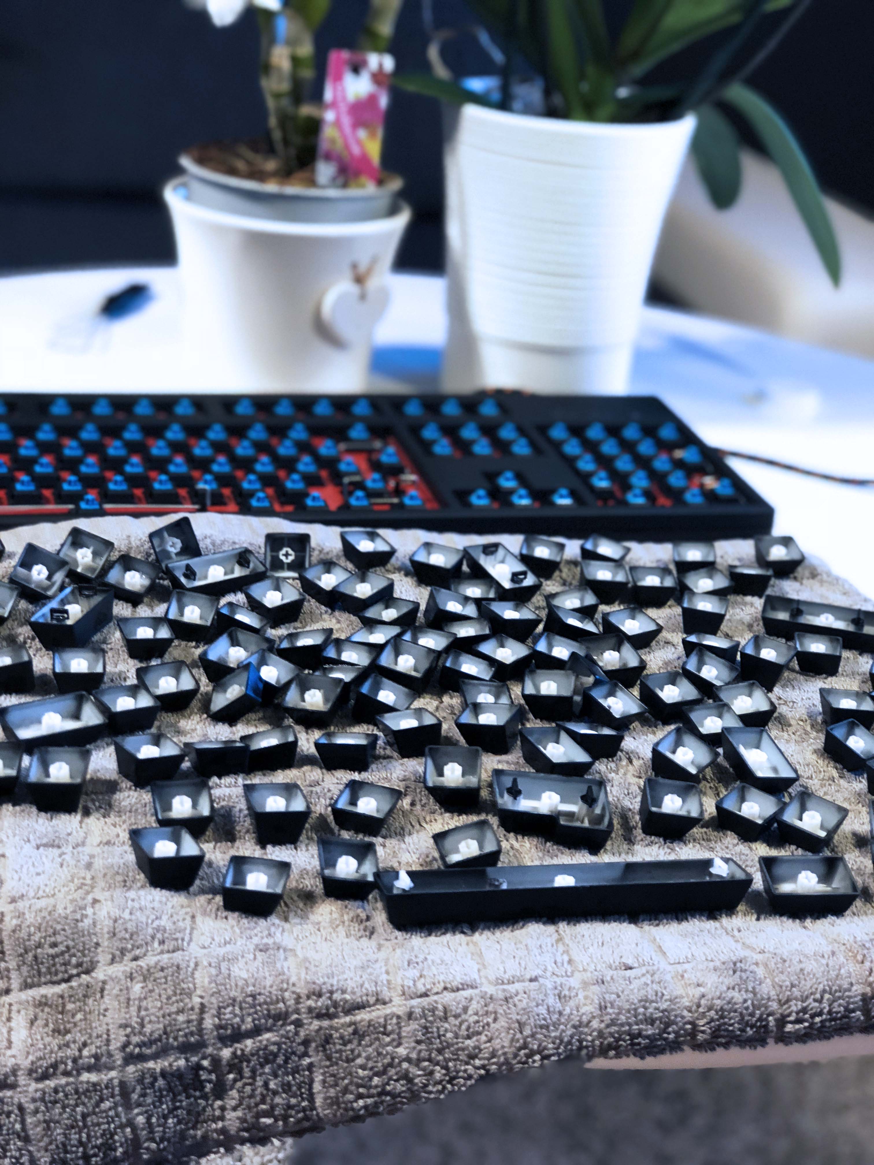 Nu börjar det likna något! När brytarlocken har torkat – och se verkligen till att de är helt torra – så är dags att börja sätta tillbaka dem på tangentbordet. För brytarlocket i position över brytarstammen och tryck ned på locket.