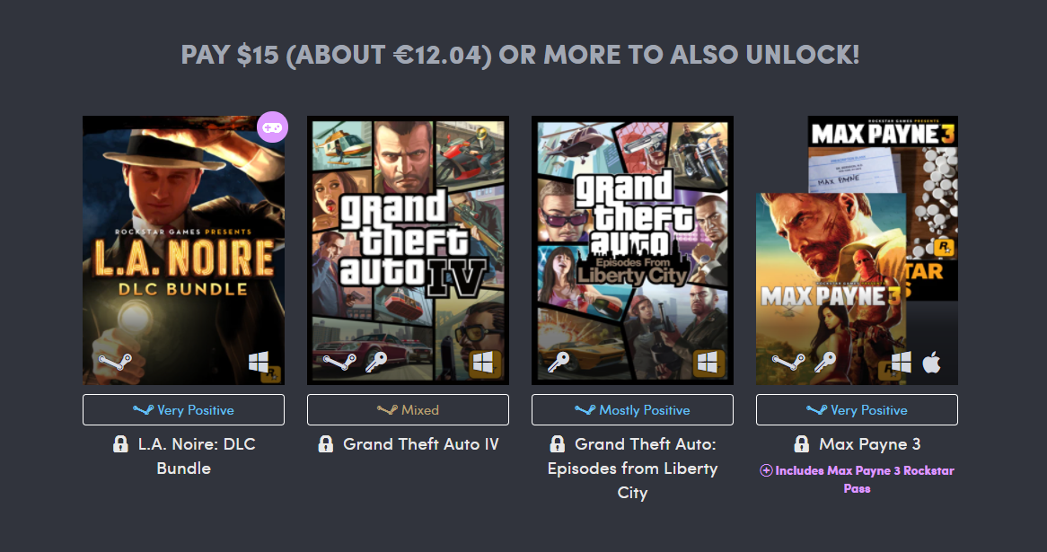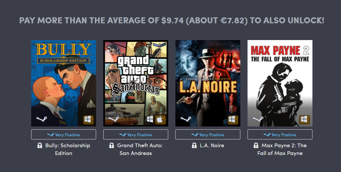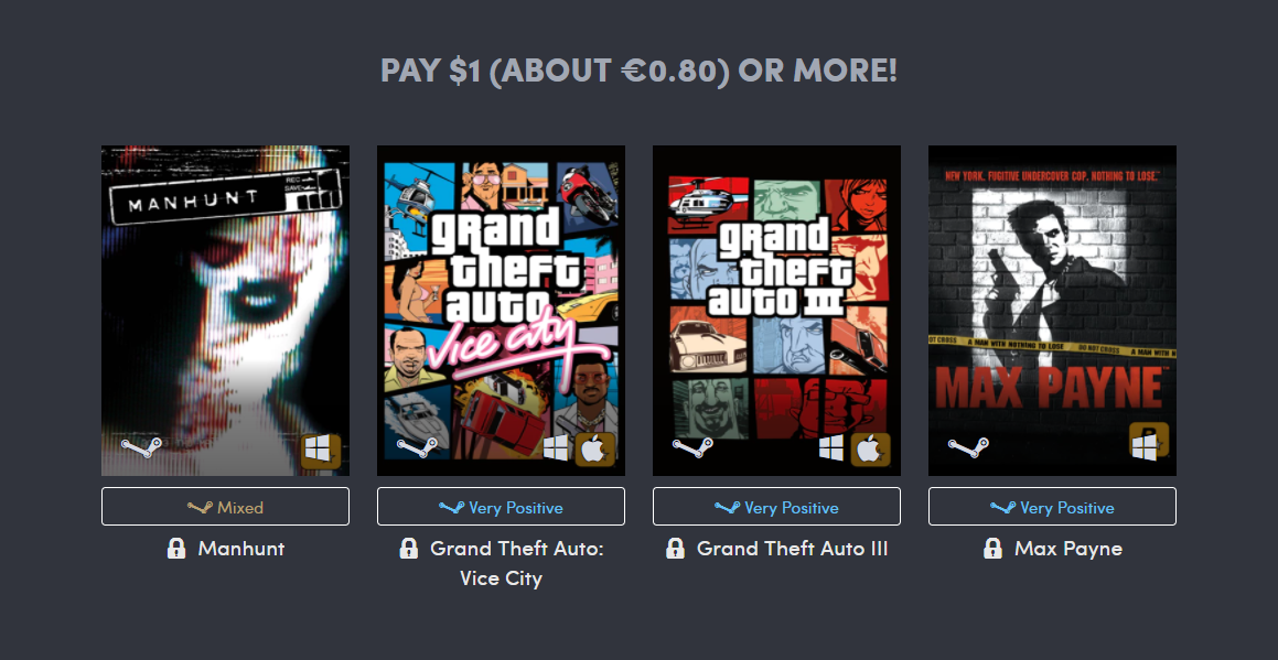 Det billigaste paketet som kostar endast en dollar (cirka 8 svenska kronor) innehåller spelen Manhunt, Grand Theft Auto III, Grand Theft Auto: Vice City och det första spelet i Max Payne-serien.