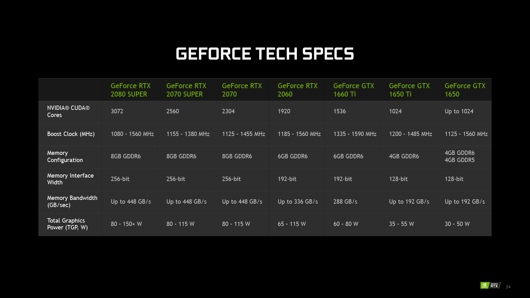 Geforce RTX 2080 Super erbjuder 3 072 CUDA-kärnor och upp till 1 560 MHz klockfrekvens hos grafikprocessorn. Denna flankeras av åtta gigabyte 14 000 MHz GDDR6-minne över en 256-bit minnesbuss för en total minnesbandbredd på upp till 448 GB/s. Detta med ett TDP-värde på “150 W+”. Dess mer energieffektiva variant håller sig till en maximal klockfrekvens på 1 080 MHz för ett lägre TDP-värde på 80 W.