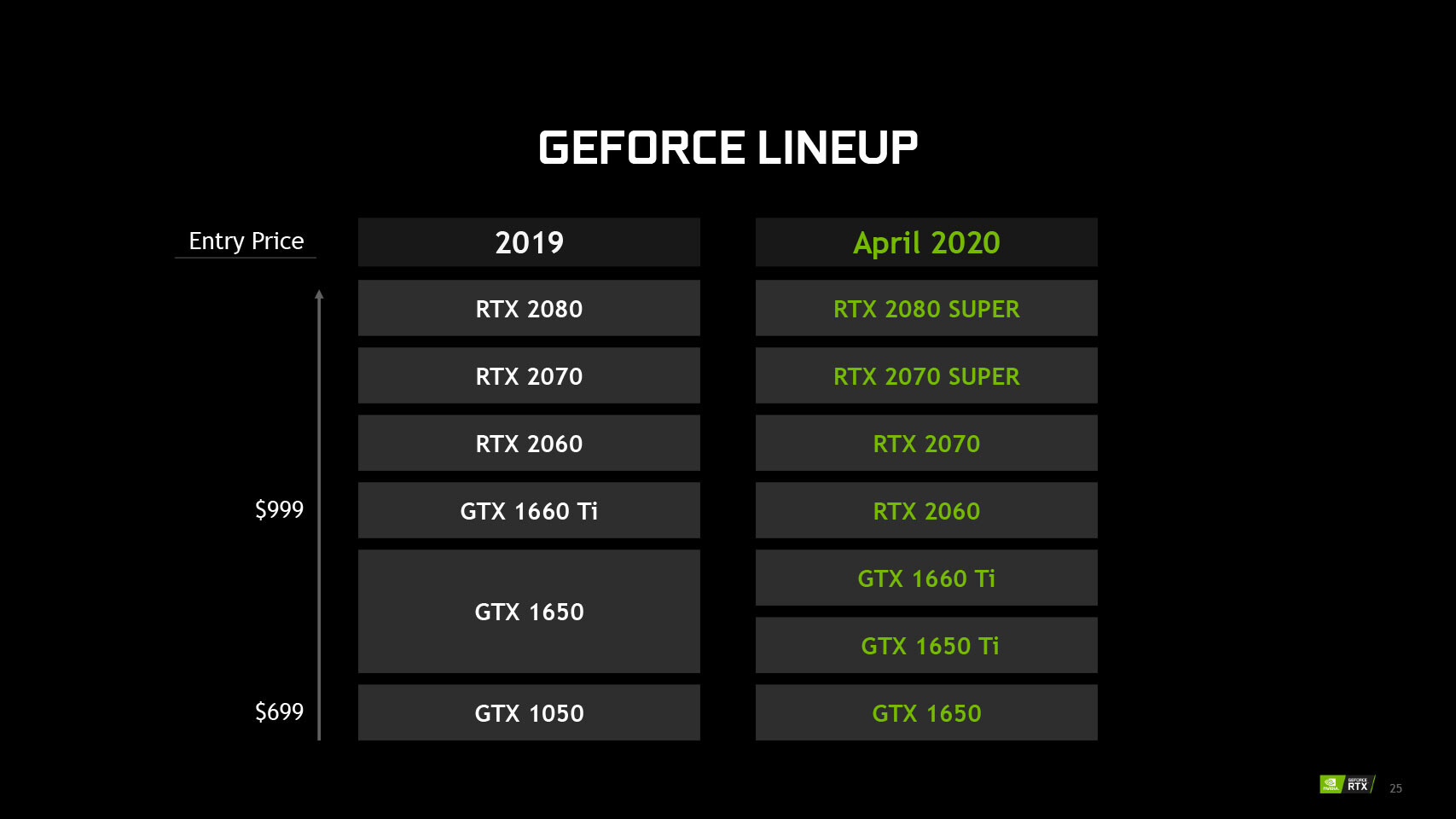 Med introduktionen av dessa nya grafikkortsmodeller stöper Nvidia även om bland riktpriserna för flera modeller. Både RTX 2080 Super och RTX 2070 Super ersätter sina icke-Super-syskon och RTX 2070 (icke-Super) knuffas ned till den prispunkt där RTX 2060 tidigare låg. Detta resulterar att även RTX 2060 prisjusteras och hamnar på samma nivå som GTX 1660 Ti tidigare låg på.