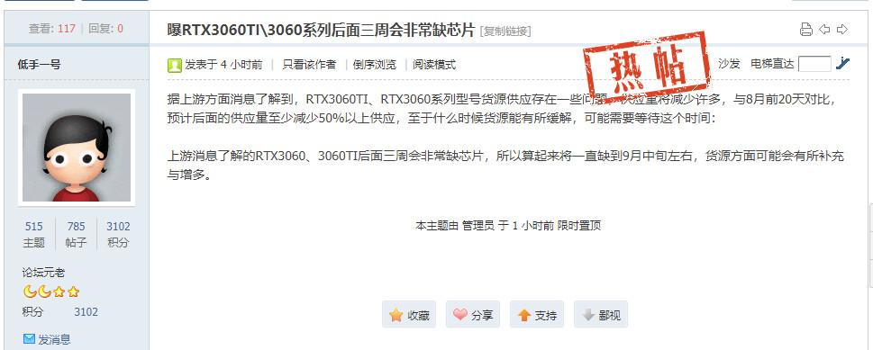 Ett inlägg på Board Channels Forums hävdar att september månad kommer att se upp till 50 procent färre leveranser av Nvidias Geforce RTX 3060 och RTX 3060 Ti. Detta rykte stärks även av hemsidan Videocardz som menar att flera fabriker i Kina har fått stänga igen eller dra ner på arbetsstyrkan på grund av Covid-19.