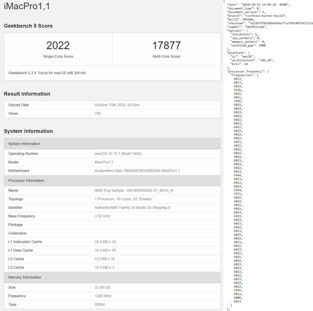 AMD:s kommande flaggskeppsprocessor Ryzen 9 5950X med sina 16 kärnor och 32 trådar har till synes testats i den syntetiska testsviten Geekbench 5. Det ska röra sig om ett ingenjörsexemplar av processorn som överklockats till hela 6 gigahertz (GHz). Denna listas av databasen som del av en Apple iMac Pro, däremot är det i själva verket en så kallad “Hackingtosh” som testats. Apple har således förmodligen inga planer på att lansera en Ryzen-baserad Mac-enhet innan det blir dags för företaget att exklusivt förlita sig på egna kretsar.
