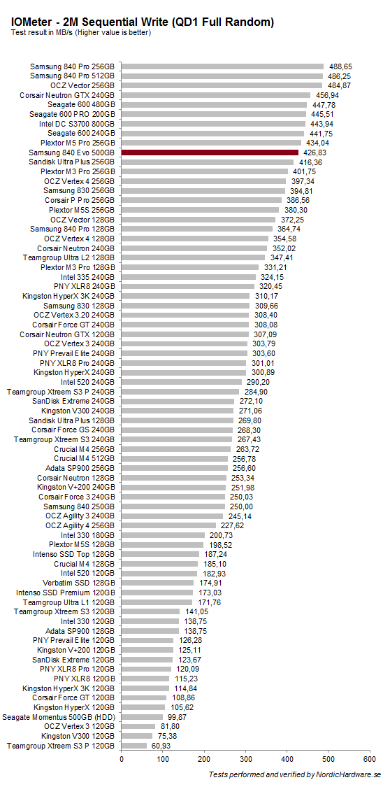 Sekventiell läsning begränsas av SATA-gränssnittet och inte helt oväntat så hamnar 840 Evo riktigt högt upp.