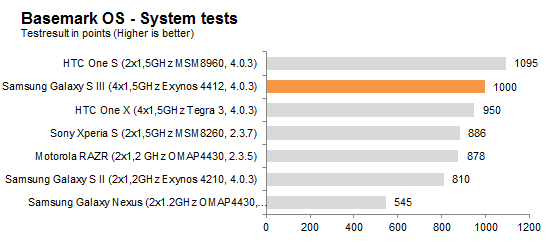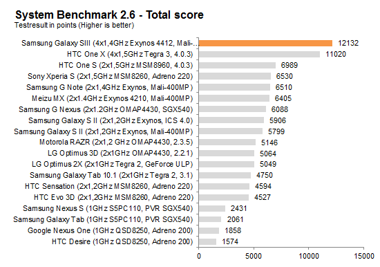 Inte helt oväntat presterar 4412 bra i System Benchmark då det testet har stöd för fyra kärnor. Däremot blir tävlingen med Tegra 3 lite viktigare då de har samma förutsättningar och likt förra året så kommer Exynos och snor förstaplatsen från Tegra.