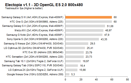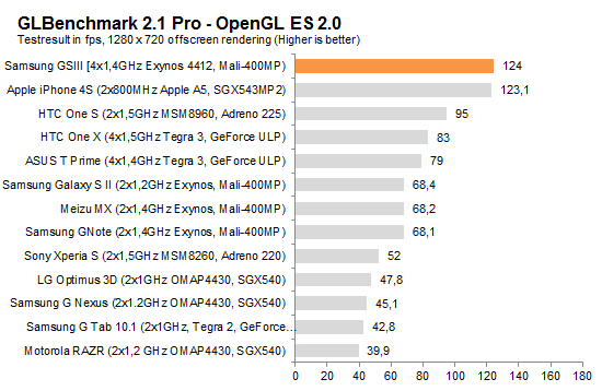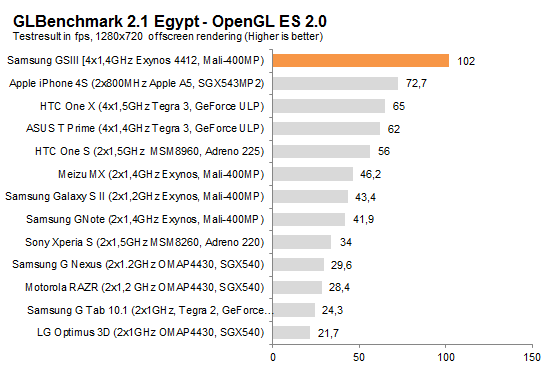 Det var många frågetecken kring att använda en gammal GPU och många hade hoppats på att Galaxy S3 skulle få den nyligen uppvisade T-604, men vi kan nog alla hålla med om att redan Mali-400 är riktigt kraftfull. För första gången någonsin har vi en Android-telefon presterar bättre än Iphone 4S i Egypt och PRO och jämför vi med den lägre klockade versionen av Mali-400 så är skillnaden enorm. Med GL testerna pratar vi inte om poäng, vi pratar bildrutor per sekund där skillnaden faktiskt är något man kan märka. Är man van vid spelande vet man att det är en stor skillnad att gå från fps med ett snitt på 40 till 100.